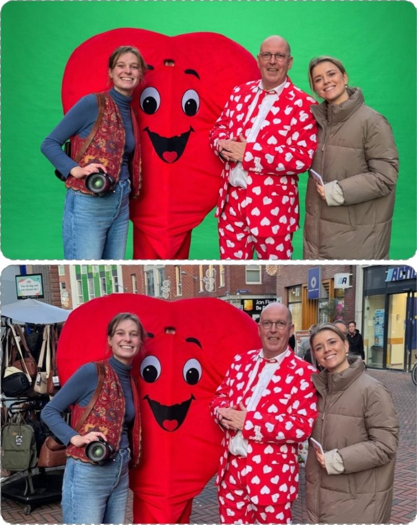 Die groene kleur kan digitaal worden verwijderd, zodat je er een andere achtergrond voor in de plaats zet — bijvoorbeeld een tropische achtergrond, strand, natuur en veel meer...
